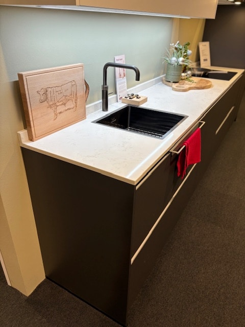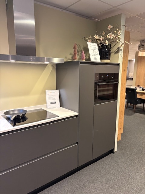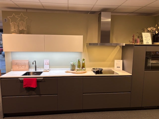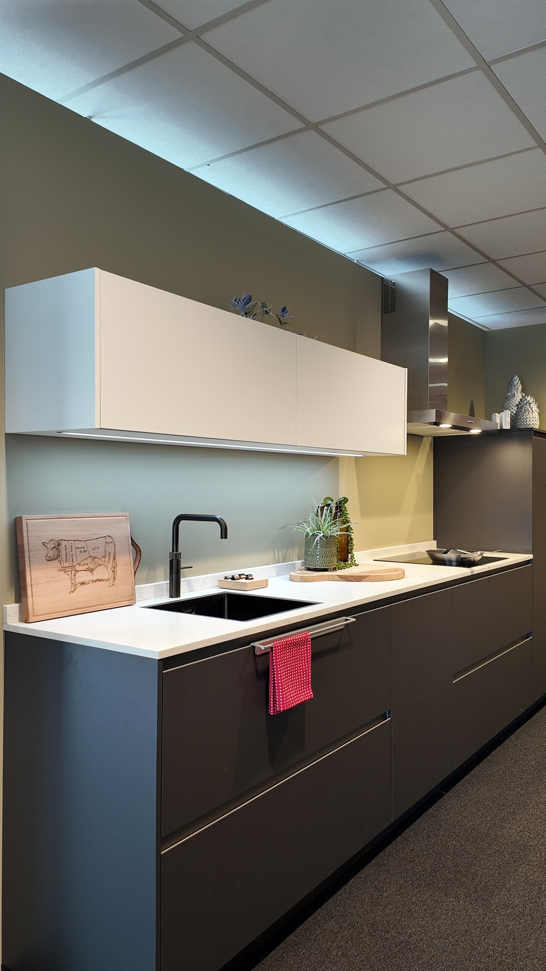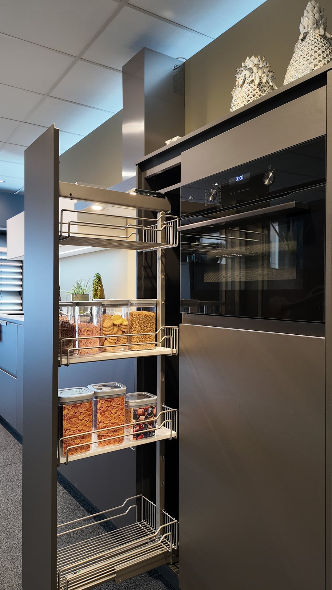 De opstelling is voorzien van 2X grote laden van 120 CM breed. Hierdoor wordt de ruimte optimaal benut met praktische opbergruimte. De 2 strakke vouwkasten boven passen helemaal in het design. Naast de halfhoge kast waar de compacte bakoven en koeler in zitten. Staat een luxe apothekerskast, ideaal voor de kruiden en geeft meer body aan de kastenwand.