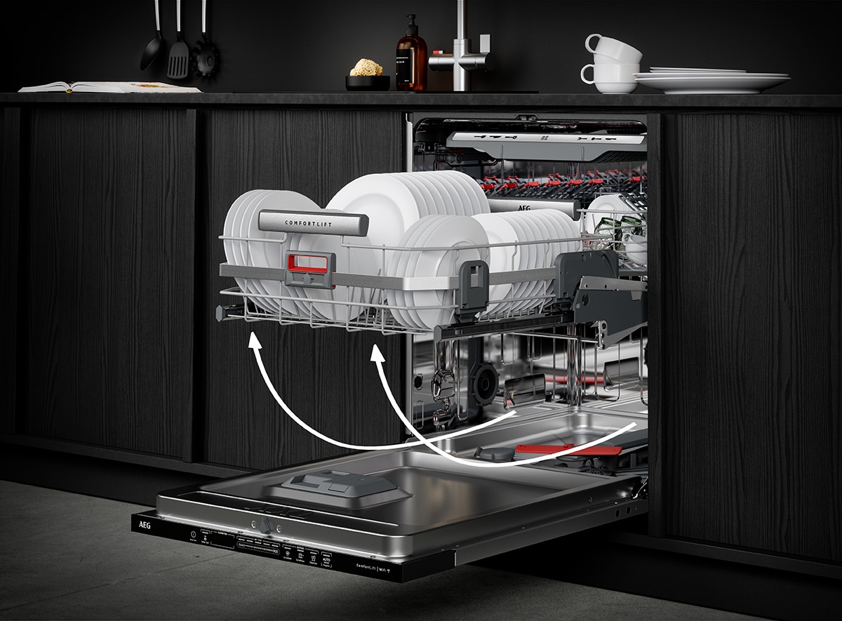 De AEG ComfortLift® vaatwasser is de eerste vaatwasser waarbij de onderste korf – met belading – bij het uitrijden vanzelf omhoog komt. Zo kun je, zonder te bukken, efficiënter uitladen en doeltreffender inladen. Maximum belading tot 18 kg.